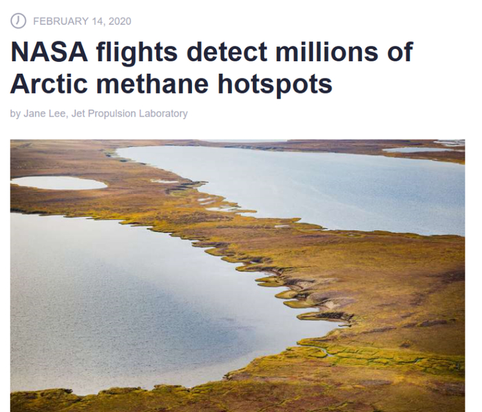 无独有偶,地球另一端也有新闻爆出——2月14日,美国宇航局(NASA)的一项研究指出,在30万平方公里的北极地区,发现200万个甲烷排放热点。