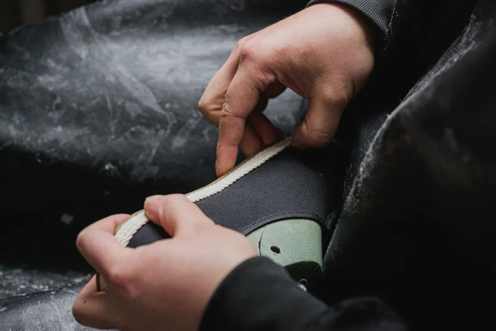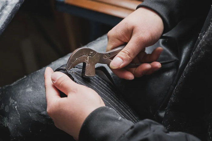 接着用钳子将鞋帮不断固定在鞋底,并不断修正,确保褶皱松量均匀分布在鞋底上。