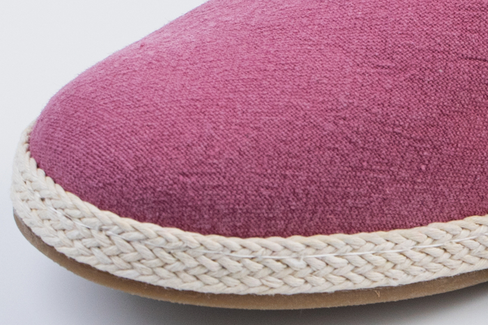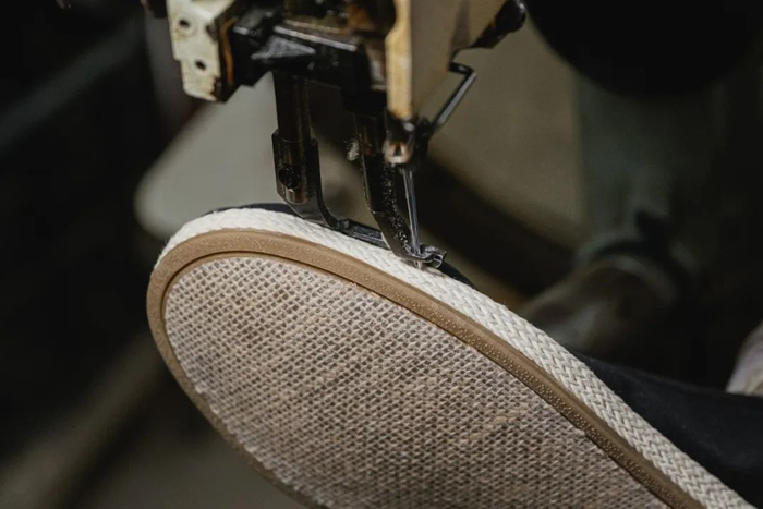 正绱:将麻绳橡胶底面与艾绒中底通过胶水,120℃高温烘烤,约15~20分钟,最后通过物理方式,重压定型,使橡胶底完全粘合。