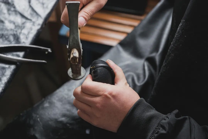 排揎:将对应号型的鞋楦放入鞋内,给鞋面刷些清水,用锤子捶打鞋楦使鞋面与鞋楦贴服,不打皱,排除绷楦可能存在的气泡,缝隙等不粘合的情况。