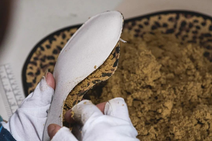 绷楦(定型):绱鞋是将制好的鞋底与鞋帮缝合的过程,首先需要用小钉子将艾绒中底固定在对应尺码的鞋楦上,将鞋面嵌套在鞋楦上,确保鞋面平整服帖不偏斜。