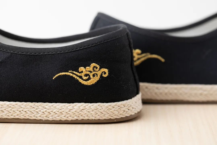 刺绣款在鞋尾外侧有一朵金色祥云刺绣,典雅大气的黑色辅以金丝制成。