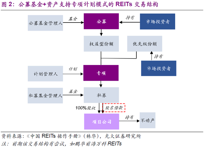 根据试点方案,目前基建公募REITs采用公募+ABS架构,主要由于REITs相关税收政策尚未出台。公募+ABS结构可以通过股东借款给项目公司的形式实现实际“税收中性”的待遇。不过,这一架构设计较为复杂,治理结构亦较为复杂,且无法实现底层资产“真实出表”的效果。未来随着基建公募REITs的持续推进,法律法规的完善(尤其是配套税收相关制度完善),将能够实现海外标准REITs的效果。本次文件是国内公募REITs的关键突破,项目试点的同时,我们认为配套规则亦将逐渐完善。