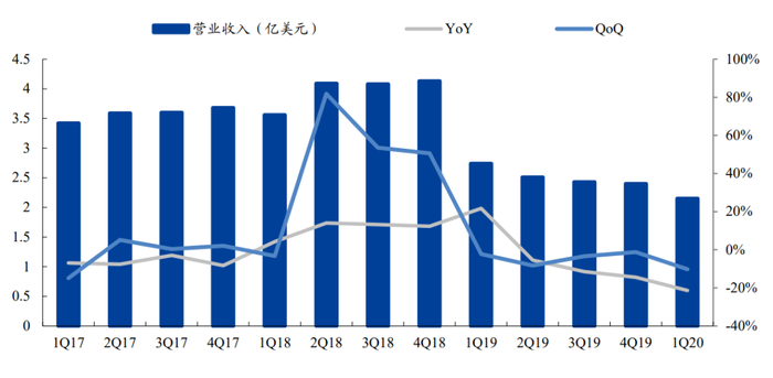 Cree 1Q20营业收入为2.155亿美元,同比下降21%,环比下降10%,其主要原因为新冠肺炎背景下带来的需求疲软。净利润为-0.61亿美元(non-GAAP净利润为-0.16亿美元),同比上升73%,环比下降16个百分点。受益于公司产品组合的优化,公司实现毛利率28%,另外,1Q20的净利率为-28%。摩根希尔工厂在3月份停工两周,对公司业绩造成较大影响。