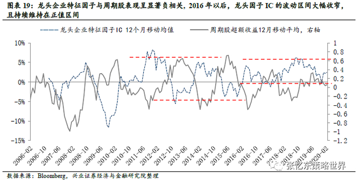 2)港股周期股的超额表现与龙头因子IC在时间序列上形成周期性负相关;