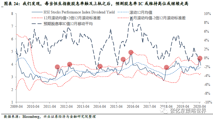 2020年 3月 31日恒生指数股息率达 4.41%,这一数值突破我们模型构建的股息率运行值上轨,符合局部极值的判断,因此,我们认为当下是配置港股高股息股票的好时机。同时,建议采用我们上述构建的质量加强预期股息率因子组合,以规避上市公司超预期减少分红的风险,如此,策略胜率更高。
