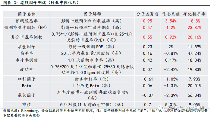 基于恒生综指成分股,我们测试了估值、质量、成长、价量等因子(月度调仓,5分位分组),股息率在多空组合夏普比,信息系数(或称IC)均值、年化换手率的得分均靠前。