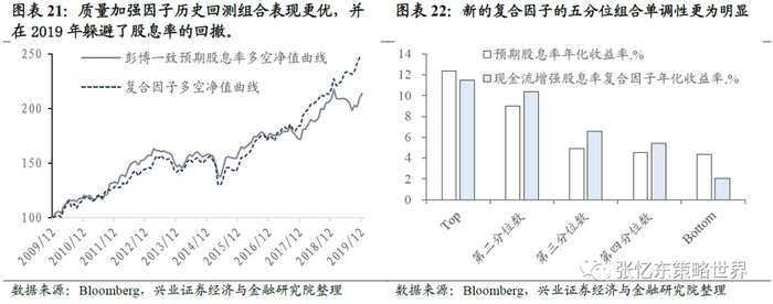 质量加强预期股息率因子历史回测组合表现更优。质量加强股息率因子多空组合夏普比率达到1.09,高于预期股息率因子的0.95。并且,新的复合因子的五分位组合年化收益率单调性更为明显,末尾组合剔除效果更佳。质量加强股息率因子多空组合净值曲线收益风险比更高,并在2019年躲避了股息率因子多空组合的回撤。