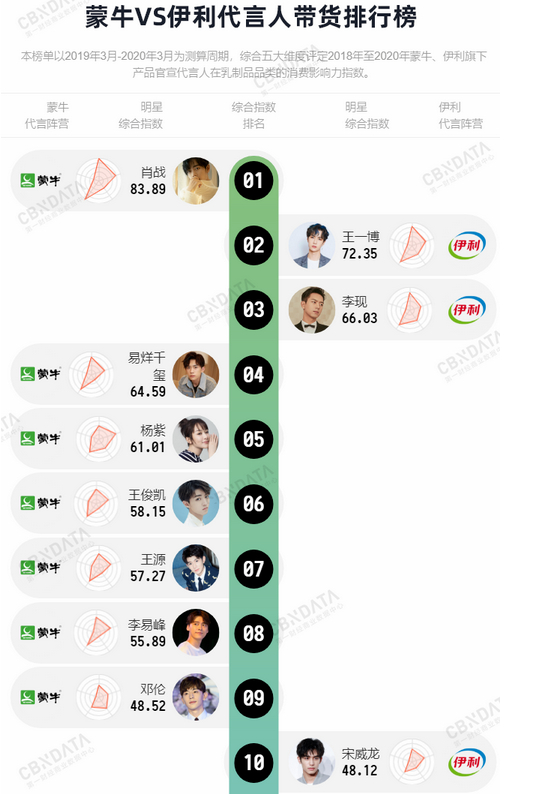 第一财经商业数据中心(CBNData)星数根据CBNData消费数据评出的2018年至2020年伊利蒙牛带货排行榜显示,前10名中,蒙牛代言人独占7席,伊利3席,基本均为流量明星,其中带货能力第一名的正是前不久陷入风波的人气小生肖战。近年来不少流量明星“小鲜肉”爆出的动辄上千万元的广告费,也可见品牌商对他们的青睐程度。