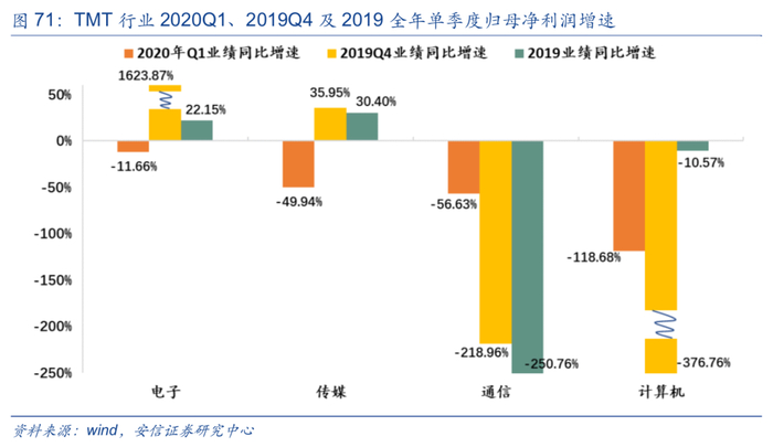 从2019年报和2020一季报业绩来看,2020Q1单季度TMT各行业业绩均下滑,通信行业环比2019年上升194.13pct,电子、传媒、计算机环比2019年分别下滑33.81pct、80.33pct、108.12pct。