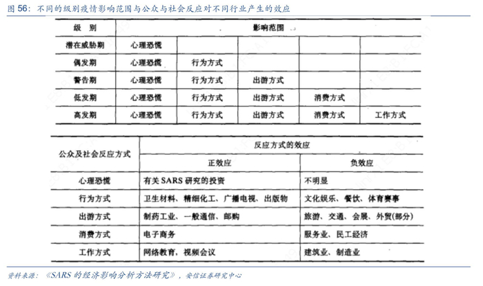 从疫情影响根源的角度来看,由工作方式导致的负面影响最快消退,由心理恐慌导致的负面影响持续最久。根据不同的级别疫情影响范围,可以看出随着疫情不断升级,负面影响范围会不断扩张,疫情影响根源从心理恐慌——行为方式——出游方式——消费方式——工作方式。对应的,我们可以看到负面影响的行业从文化娱乐业、餐饮、体育赛事——旅游、交通、会展、外贸(部分)——服务业——建筑业、制造业。不难看出,疫情影响根源越靠前,其负面影响持续时间越长。例如,心理恐慌持续时间最长,将受到全球疫情和疫苗生产进度的影响;工作方式负面影响持续时间最短,可以看到目前各行业复工复产,学生复学都已经接近正常水平。