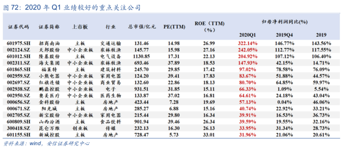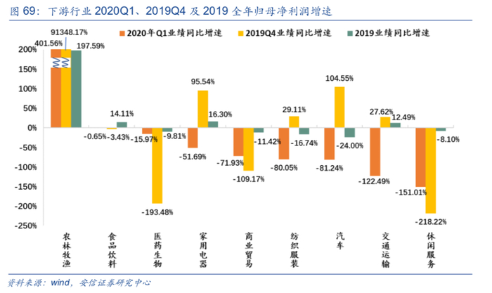 从2019年报和2020一季报业绩来看,2020年Q1下游各行业中,农林牧渔业绩同比增长401.56%,环比2019年全年上升203.97pct。同时,食品饮料、医药生物业绩降幅相对较小,分别为-0.65%、-15.97%,环比2019年全年变动-14.76pct、-6.31pct。