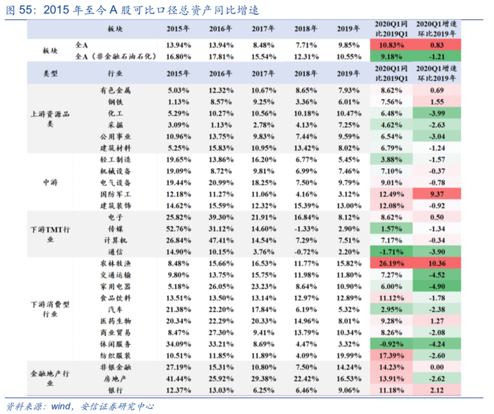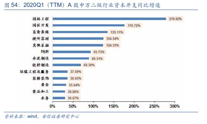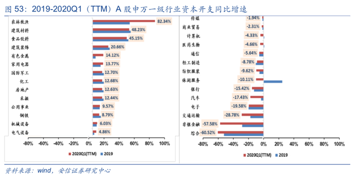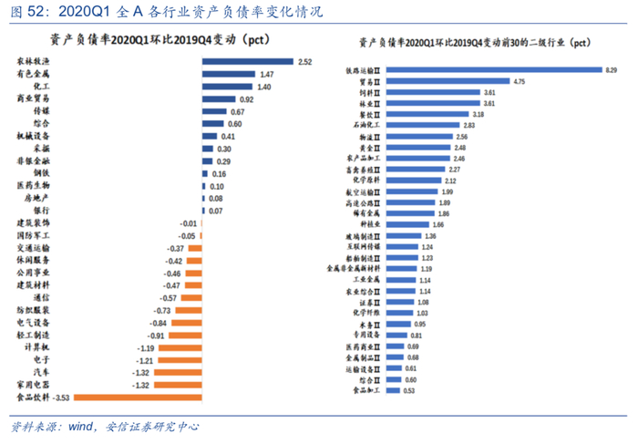 分行业来看,农林牧渔、有色、食品饮料、建筑装饰、国防军工正处于资产扩张状态。分行业来看,2020Q1资产负债率提升较为明显的一级行业为农林牧渔(+2.52pct)、有色金属(+1.47pct)、化工(+1.40pct)、商业贸易(+0.92pct)、传媒(+0.67pct)。从二级行业来看,铁路运输、贸易、饲料、林业、餐饮、石化、物流和黄金等领域资产负债率提升较为明显。结合2020Q1(TTM)资本开支增速来看,资本开支前五主要为农林牧渔(+82.34%)、建筑材料(+48.23%)、食品饮料(+45.15%)、建筑装饰(+20.66%)、有色金属(+14.12%);增速后五的行业为综合(-60.52%)、非银金融(-57.58%)、交通运输(-28.78%)、电子(-19.58%)、汽车(-17.53%)。可以看出,农林牧渔、有色、食品饮料,建筑装饰和国防军工处于资产扩张状态,这点和A股可比口径下总资产同比增速的情况大体一致。