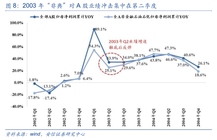 2003年二季度A股业绩短暂受到SARS影响后逐季改善,得益于中国开始深度融入全球化进程,疫情未产生深远影响。2003年“非典”疫情从2002年11月下旬开始初露端倪,2003年3-4月达到高峰,6-7月趋向缓解。2003年第一、二、三、四季度A股非金融石油石化的归母净利润累计同比增速分别为54.32%、25.08%、29.61%、38.06%。不难看出,“非典”疫情对A股业绩的短期影响主要集中在2003年第二季度(环比下滑约30pct),即疫情扩散最严重的区间。疫情结束后社会生产生活全面恢复,A股业绩也逐步恢复。同时得益于2003年中国开始深度融入全球化进程,“非典”疫情虽对A股业绩造成短期冲击,整体依然保持正增长。