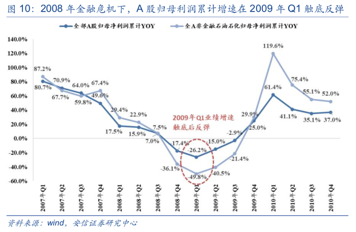 2008年金融危机导致A股业绩在2009Q1后逐季改善,“四万亿”刺激政策出台后有效对冲危机影响。2008年金融危机也对中国A股业绩造成显著影响,2007年A股业绩持续高增长,进入2008年后,即便金融危机的逐步蔓延, A股业绩增速下降幅度明显增大,2008年一、二季度A股业绩累计同比增幅分别为17.50%、15.91%,A股非金融石油石化累计同比增幅分别为29.41%、22.86%,但依然维持在较高水平。进入2009年第二季度之后A股业绩降幅逐渐收窄。随着国内出台的四万亿刺激计划等政策措施,2010年A股业绩开始转正。