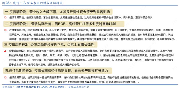 在此前外发的专题报告《疫情下的机构配置:逻辑、转变和预测》中,我们梳理了疫情于A股基本面在财务逻辑上的传导,并提出对于疫情后的四个阶段: