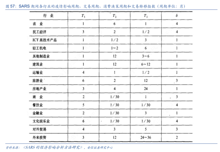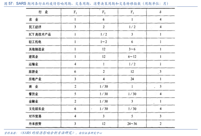 从疫情影响周期的角度来看,科技行业负面效应消退较快,金融、地产其次,文化娱乐、餐饮等消费类服务业行业负面影响较为持久。若T1>T2>T3, 且δ=3或4,则负面影响持续较久,例如文化娱乐、餐饮、运输、民工经济、对外贸易等。若T1>T2且T1<t3,则疫情的负面影响是暂时的,因为需求周期要长于交易周期,需求可能重新释放,例如旅游、地产、金融和商业。若t1<t2,疫情负面影响将最快消退,甚至不产生影响。例如高技术产品、农业、建筑业、外来投资等。其中,t1指的是影响周期,t2指的是交易周期、t3指的是消费决策周期,δ为交易转移指数。< p=“”>