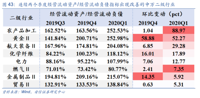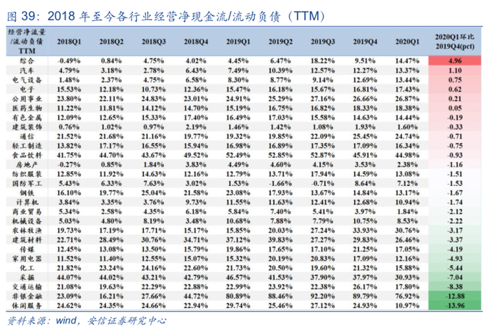 从经营活动现金净流量与营业收入的比值(TTM)来看,电气设备、医药生物、有色金属、农林牧渔等经营净现金占收入比率增长。28个一级行业中有7个行业2020Q1经营活动现金净流量占营业收入比例环比2019Q4经营活动现金净流量占营业收入比例增长,涨幅排名前五的行业分别为银行(+59.05pct)、电气设备(+0.88pct)、汽车(+0.77pct)、医药生物(+0.38pct)、有色金属(+0.19pct)。减少幅度最大的5个行业分别为休闲服务(-4.96pct)、非银金融(-4.80pct)、交通运输(-3.33pct)、房地产(-3.25pct)、食品饮料(-2.59pct)。