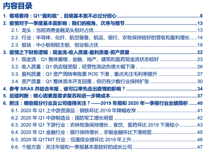 当然,“盈利底”只是对A股一季报业绩增速最直观的判断。面对超过3800家上市公司沉甸甸的2019年年报和2020年一季报,有许多复杂的现象和问题值得我们探索和思考;同时,基于此前我们对A股基本面长期的跟踪和判断,想进一步验证和了解的内容也有很多。经过一段时间的梳理,我们将从以下几个方面入手: