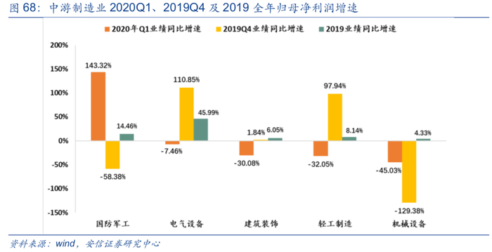 从2019年报和2020一季报业绩来看,2020年Q1中游制造业各行业的业绩增速中,除国防军工外均有所下滑。