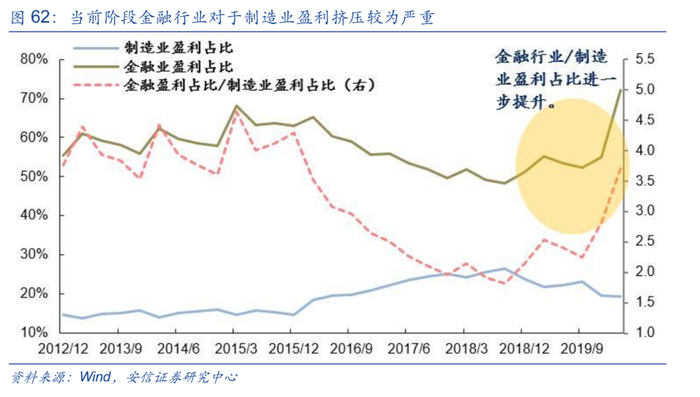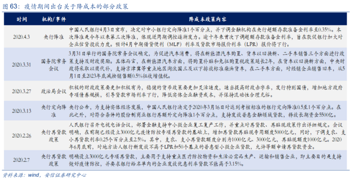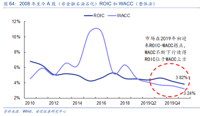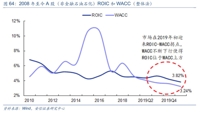 从微观而言,降成本政策正在持续推进,这将有利于制造业企业资产负债表修复。在2019年底外发的专题报告《2020年A股基本面的核心因素是什么?》中,我们提到在稳杠杆和减税降费保持不变的前提之下,影响2020年A股基本面的核心变量将从2019年的去杠杆政策放缓逐渐转移到以降成本为核心的金融供给侧改革上。具体而言,当前的A股金融行业盈利占比明显升破55%的“警戒线”,达到接近70%的水平,制造业盈利水平受到了严重挤压。为了防止制造业出现缩表现象,我们认为有必要通过降成本政策来助力制造业基本面修复。更加直接地说,2020年制造业基本面如若要防止进一步恶化,其支撑将很有可能是金融行业,尤其是银行的让利,实现弱复苏之后明显的修复过程或将在2021年出现,届时进而带动A股基本面出现进一步回升。从目前陆续推出的降成本政策来看,正在逐步验证我们在2019年底的想法。一个侧面印证是从ROIC-WACC的角度来看,WACC正在持续下降且下滑幅度明显,2020Q1全A(非金融石油石化)WACC为3.24%,ROIC为3.82%。