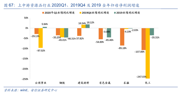从2019年报和2020一季报业绩来看,2020年Q1上中游资源品行业业绩均不同程度受损,其中,化工和采掘行业业绩下滑最为明显,钢铁环比2019年降幅收窄。