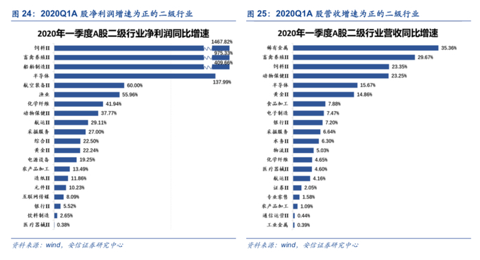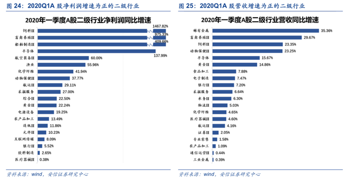 从二级行业来看,我们关注到饲料、畜禽养殖、航空装备、半导体、化学纤维、银行、航运等细分领域保持着较好的营收和盈利增长。具体而言,2020年Q1归母净利润增速排名前五的分别为:饲料(+1467.82%)、畜禽养殖(+ 975.33%)、船舶制造(+ 409.66%)、半导体(+ 137.99%)、航空装备(+ 60.00%)。营收排名前五位的分别为:稀有金属(+35.36%)、畜禽养殖(+29.67%)、饲料(+23.35%)、动物保健(+23.25%)、半导体(+15.67%)。