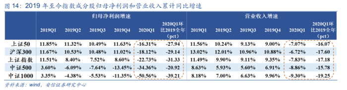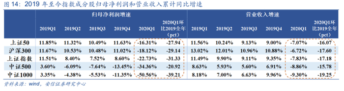 这点可以从A股主要的指数成分股中得到侧面印证,2020Q1上证50业绩同比下降幅度最小。具体而言,上证50、沪深300、中证500、中证1000和上证指数2020年Q1归母净利润累计同比增速分别为-16.31%、-18.21%、-34.36%、-50.56%和-22.73%,环比2019年大幅下降。其中,上证50的2020年Q1业绩同比降幅最低,中证1000指数盈利下滑最为明显,较2019年全年下降39.21pct。从营收增速看,2020Q1中证1000指数营收下滑幅度最大为9.30%,环比2019全年下滑19.25pct。