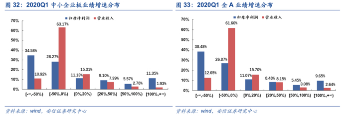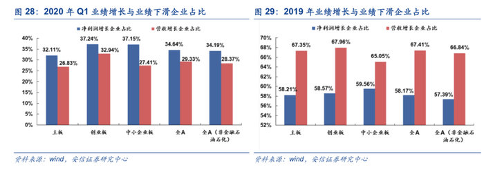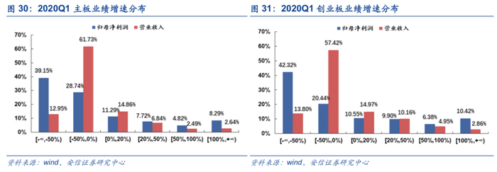 从整体业绩增减分布来看,中小创相对要好于主板。2020年Q1全A净利润增长的公司占比34.64%,业绩下滑的公司占比65.36%,整体受疫情影响较大。其中,主板、创业板、中小企业板业绩增长的公司分别占比32.11%、37.24%、37.15%。