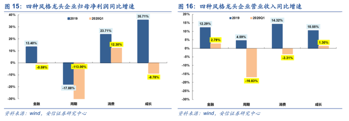 面对疫情冲击,从目前来看业绩表现排序:消费龙头>金融龙头>成长龙头>周期龙头。在这里,我们选取中信风格指数(金融、周期、消费、成长)中总市值前10%企业的业绩表现来看,营收方面,周期行业龙头同比-16.83%冲击最为严重,金融(+2.79%)、成长(+1.30%)龙头保持营业收入同比正增长。从归母净利润的角度看,消费龙头表现出强大的盈利韧性,Q1仍同比增长12.30%,其余风格龙头归母净利润均有不同程度下滑。整体来看,在疫情背景下,消费龙头在营收下滑的背景下,盈利表现整体最为稳健。