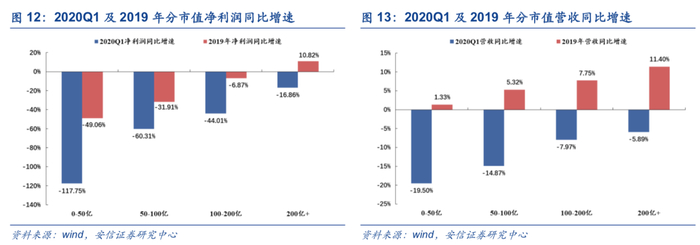 从2020Q1来看,龙头上市公司基本面也受到疫情的较大冲击,但是相对好于中小上市公司。具体而言:分市值来看,2019年低于50亿公司净利润同比下滑49.06%,200亿以上公司则实现正增长10.82%,呈现十分明显的反差。但是在2020年一季度,无论是高市值和低市值上市公司均受到疫情的严重冲击,营业和盈利均有较大幅度下滑,2020Q1市值低于50亿的公司净利润同比下滑117.75%,营收同比下滑19.50%;市值高于200亿的公司归母净利润同比下滑16.86%,营收同比下滑5.89%。不难看出,低市值公司受损严重,高市值公司表现明显好于低市值公司。
