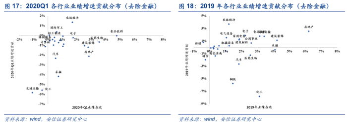 在行业盈利贡献层面来看,2020Q1盈利贡献主要来自农林牧渔和银行,汽车和化工处于弱势状态,非银则出现由贡献到拖累的转变。2020年Q1盈利贡献主要来自下游必须消费品行业和银行,盈利贡献贡献排名前五的行业为银行、农林牧渔、国防军工、食品饮料和电气设备,排名后五名的行业为交通运输、化工、采掘、非银金融、汽车。相比2019年,盈利贡献贡献排名前五的行业为非银金融、银行、农林牧渔、房地产和电子,排名后五名的行业为化工、钢铁、汽车、通信、有色金属,可以发现除去低基数导致2020Q1军工靠前外,银行和农林牧渔基本上延续2019强势状态,汽车、化工延续2019年弱势状态,非银则出现由贡献到拖累的转变。