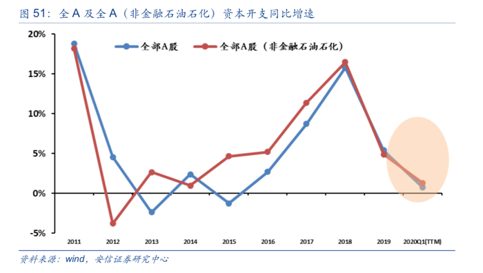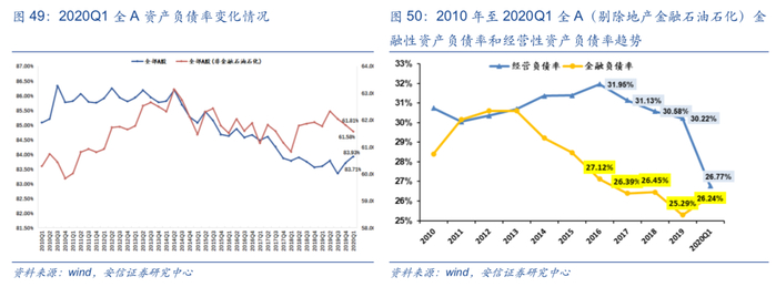 当前A股资产负债率仍处于下行趋势,主要是由于经营性负债率受疫情影响下降,金融性负债率因需要缓解短期资金流动性风险呈现上升趋势。早在此前外发的报告《一场关于资产负债率的使命担当与变革重塑》中,我们提出资产负债率将是未来1-3年影响A股基本面的核心因素。从目前来看,A股大多数企业资产负债率仍在下滑,2020Q1全A(非金融石油石化)资产负债率进一步下滑至61.58%,整体上资产负债表仍处于缩表状态。从结构上看,受疫情影响,全A(非地产金融石油石化)经营负债率已经在2020Q1明显下滑至26.77%,说明商业信用大幅萎缩。与其同时,金融负债则出现一定回升,说明很多企业在疫情背景下需要借助信用融资来缓解短期资金流动性风险,而非扩大生产。一个侧面印证是从全A资本开支情况持续恶化。具体而言,全A(非金融石油石化)2019年资本开支增速为4.88%,环比2018年增速16.47%下滑11.60pct。而2020Q1随着疫情的发展,资本开支增速为1.31%,环比出现进一步下滑。