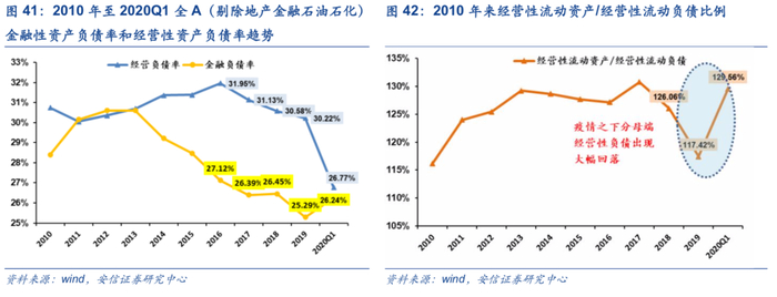 受疫情影响,当前收入质量的矛盾主要在于2020Q1经营性流动负债大幅下滑。早在2019年6月外发的专题报告《一场关于资产负债率的使命担当和变革重塑》中,我们提出:“在目前去杠杆、金融供给侧改革以及减税降费的政策组合拳下,未来1-2年影响全A(非金融石油石化)业绩的核心因素将是资产负债率,尤其代表商业信用的经营性负债率的上升。” 从目前来看,受疫情影响,代表A股(非地产金融石油石化)商业信用的核心指标经营性负债率出现了明显下滑。从2017年去杠杆以来,经营负债率呈现出逐步下滑的趋势。在疫情冲击之下下滑迅速,其中全A(非地产金融石油石化)经营负债率已经在2020Q1明显下滑至26.77%,而与其同时金融负债出现了明显回升。同时,2020Q1经营性流动资产也出现环比下滑,但由于经营性流动负债下滑更加明显,相对经营性流动负债的比例也在2020Q1出现大幅提升。