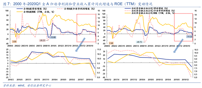 如何理解2020Q1是A股当前阶段基本面的“盈利底”?首先,让我们看一组数据:从归母业绩增速来看,2020Q1全A归母净利润同比负增长23.47%,剔除金融石油石化后进一步回落至-41.23%。从营业收入增速来看,2020Q1全A营业收入同比负增长8.82%,剔除金融石油石化后进一步回落至-11.22%。从ROE来看,2020Q1全AROE(TTM)为8.30%,剔除金融石油石化后进一步回落至6.78%。