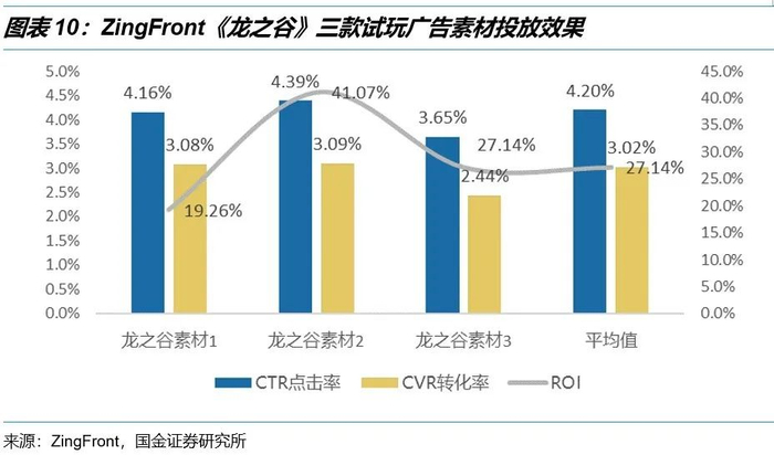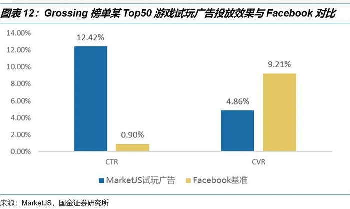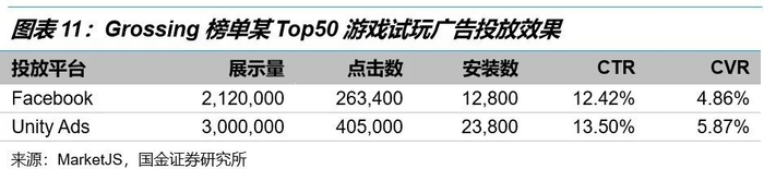 ◾ 海外市场:据MarketJS, Facebook全类型广告基准CTR为0.9%,预计试玩广告CTR提升空间可高达12倍。(1)据ZingFront,其在Facebook投放的三款《龙之谷》试玩广告素材,CTR平均达到4%,ROI最高达到41.07%;(2)据MarketJS,其客户一款美国地区Grossing榜单TOP50的游戏在Facebook和Unity ads投放试玩广告后,CTR分别为12.42%和13.50%,投放效果显著提高。