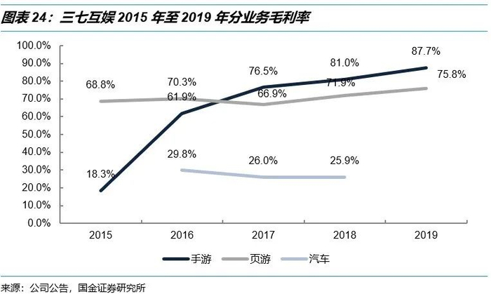 ◾ 公司营收高速增长,手游同比增长115%。2019年公司实现收入132.27亿元,其中手游收入占比90.6%,主要由两款主力游戏《斗罗大陆》H5和《一刀传世》贡献,多款游戏月流水过亿。从传统ARPG手游品类来看,该品类优势稳固,壁垒较深。游戏玩家9成左右为30岁以上中年群体,一般具有稳定收入,相较其他年龄群体有更高氪金能力。不断迭代和精细化运营之下传奇、奇迹类游戏MAU半衰期不断延长,单用户预期生命时间拉长,进一步推动LTV提升。公司也在积极开拓新品类,如非传奇、奇迹类ARPG,SLG,以及卡牌、二次元、女性向游戏等。1Q19自研产品《斗罗大陆》H5上线后连续7个月位于iOS端角色扮演类手游前十名,且打开女性玩家市场,女性用户占比20%。从分业务毛利率角度来看,公司2019年手游和页游毛利率分别为87.7%和75.8%,整体呈上升趋势,并完成剥离低毛利率汽车部件业务。
