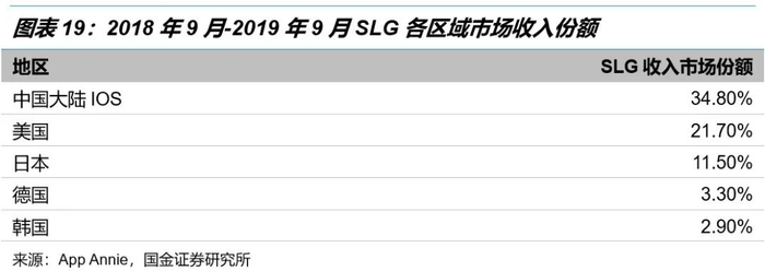 ◾ SLG是三七互娱“多元化”战略重点关注品类,有着更长的生命周期和更持续稳定的流水,即使后续减少投放,也会有长线的流水增长。根据App Annie,美国和日本市场份额分别占比21.7%和11.5%,是除中国大陆iOS以外,SLG市场最大的区域,这对于三七互娱出海,打开欧美和日韩市场有着重要意义。