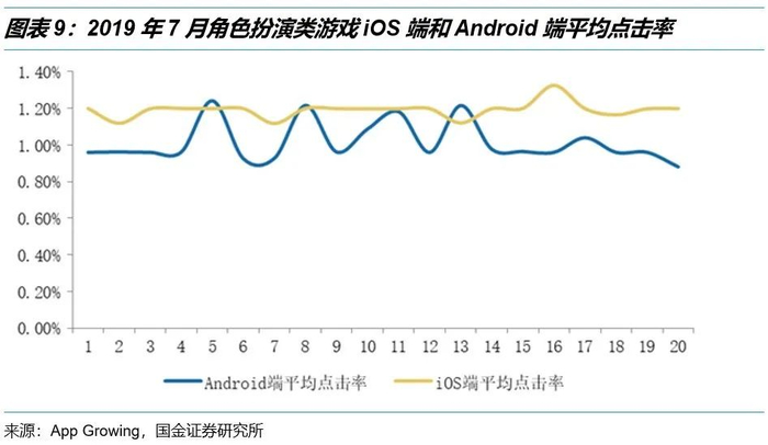 ◾ 国内市场:买量游戏点击率在1%上下浮动,主要集中区间为0.9%~1.2%。据App Growing,我们以2019年7月份iOS端和Android端角色扮演类游戏推广榜单前20名为样本,以180天为统计买量游戏曝光量和点击量的累计区间,得到iOS端平均点击率为1.2%,Android端平均点击率为1%,由于监测数据可能与实际数据存在统计误差,实际买量广告投放的点击率应当稍高一些。