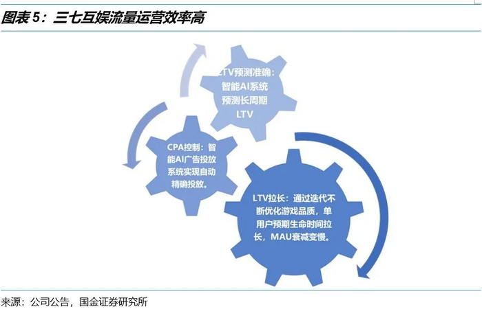 ◾ 高效买量:(1)量子智能投放系统自动投放广告,降低CPA,提高买量效率。系统首先挑选投放渠道,其次挑选针对人群,最后挑选人群感兴趣且能描述产品的素材并对数据进行分析和反馈。通过自动投放广告,能够实现24小时监控投放,节省了广告优化师投手成本,降低CPA。公司纯投手数量为50人,但“量子”系统能在同等投手数下将投放量增加30%-50%。相比于高流动性且昂贵的投手人工而言,AI系统能沉淀在公司内部,其自我学习的功能也能帮助公司不断升级。另外,量子系统可实时反馈和监测广告投放数据,能及时反映广告导量情况。(2)天机系统能有效预测长周期LTV。公司通过不断迭代发行新游戏,每一款新游戏在美术品质、音乐效果、流程优化、用户体验等方面都不断调优。该系统针对产品和运营,可以在产品上线以后进行长周期LTV预测,精确率达到98%。