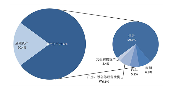在城镇居民家庭超过三百万的户均总资产中,房子占据了绝对地位,住房在实物资产中的占比接近七成,金融资产仅占总资产的五分之一;