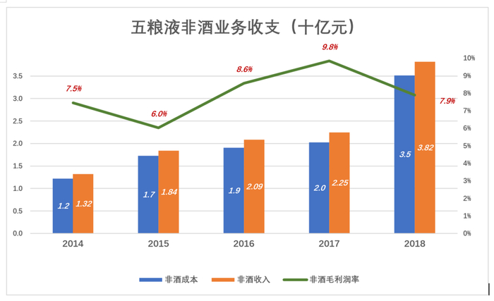 2018年,五粮液非酒业务营收22.5亿,占总营收的5.6%。