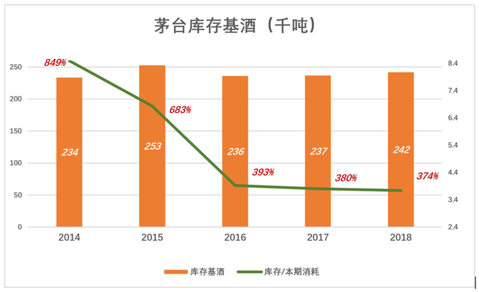再看半成品(基酒)周转天数,这个指标远不如基酒期末库存与本期消耗之间的关系值得关注。2019年末,茅台库存基酒24.2万吨,相当于2019年销售量的374%。2014年这个比例高达849%,2016年开始维持在接近400%的水平。通俗说就是,茅台不酿酒,只勾兑现存基酒,够卖4年。