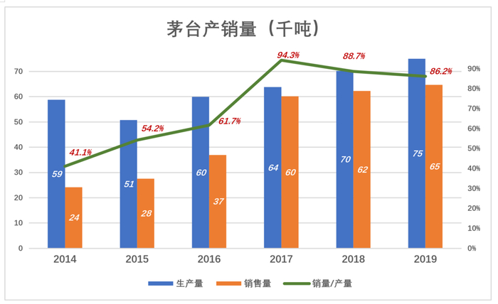 比如2019年生产的7.5万吨基酒全部进入仓库,出厂6.5万吨产品消耗等量五年以上基酒,而2014年茅台基酒产量仅为5.9万吨。也就是说,2019年茅台酒厂不仅把2014年酿造的基酒用光,还动了6000吨“老本”,按通常算法得出的产销率仅有86.2%。对茅台来讲,产销率不是越高越好,与其它白酒相比更是毫无意义。