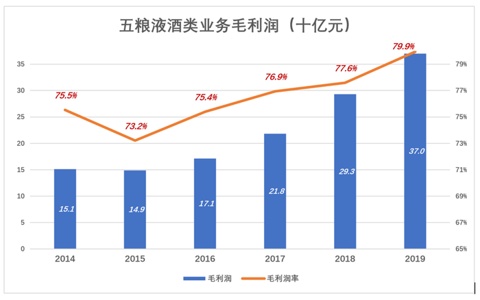 首先,高端产品对应着“高端成本”,2019年酒类业务毛利润仅比2018年提升2.3个百分点。2019年毛利润370亿,同比增长26%。