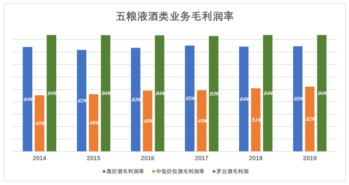 2019年,五粮液高价位酒毛利润率84.6%,被中低价位产品“拖累”后,酒类业务毛利润率79.9%(行业排名第五);再被非酒业务拖累一次,总体毛利润率74.5%。2019年茅台总体毛利润率达91.3%。严格来讲,毛利润率差距超过15个百分点的两家公司不算同类公司。