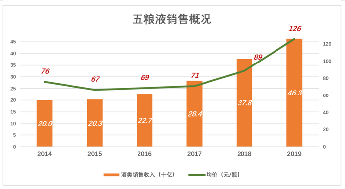 2019年五粮液酒类销售收入463亿,总销量16.54万吨,若按每瓶平均0.45公斤计算,年销3.68亿瓶,平均售价126元/瓶(注:500ml白酒,53度、43度重量分别为0.444公斤、0.454公斤)。