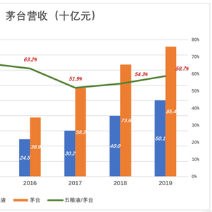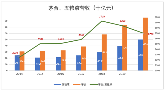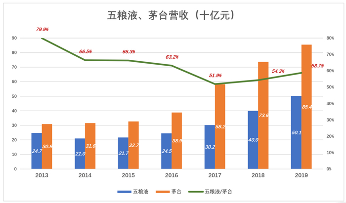 2013年,五粮液营收接近茅台的80%,随后几年逐步降到52%,最近两年有所回升,2019年营收相当于茅台的58.7%。