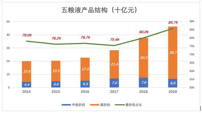从营收结构看,高价位酒是绝对的“主力”。2019年高价位、中低价位酒销售收入分别为396.7亿和66.3亿,高价位酒占比85.7%,较2018年提高5.7个百分点,2017年只有75.4%。
