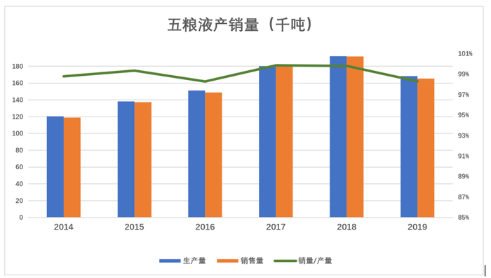 五粮液产销率接近100%,2019年入库(生产)16.8万吨、出库(销售)16.5万吨,产销率98.3%。